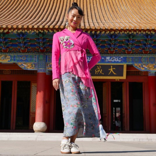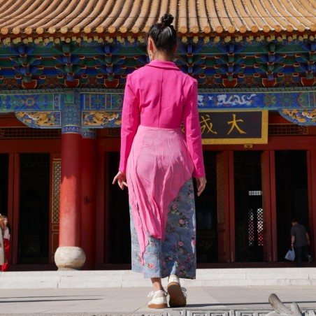 La robe portée sur les photos avec ce haut rose avec lequel elles est particulièrement bien assortie est disponible ici.