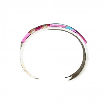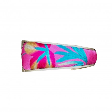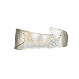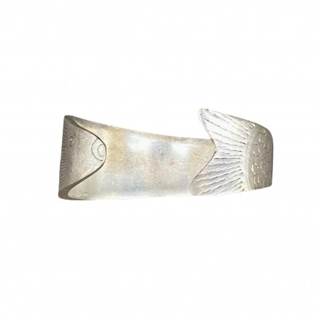 Bracelet en argent Miao orné d’une broderie ancienne Miao. L’artisan orfèvre a conçu un bijou particulièrement original en forme de poisson. Le chant des Miao a dit : le poisson provient de sciure de bois d’érable qui a plongé dans l’eau. Le poisson est chez les Miao un symbole féminin, sa forme, sa nombreuse descendance, sa souplesse quand il se meut en toutes direction sont l’expression et la métaphore de la femme. C’est un symbole propice de fertilité pour les femmes enceintes