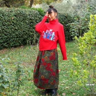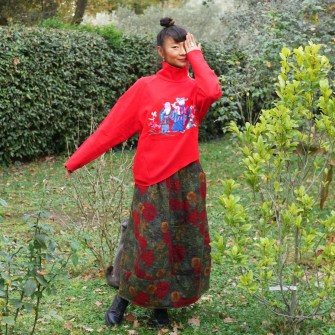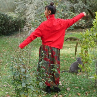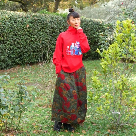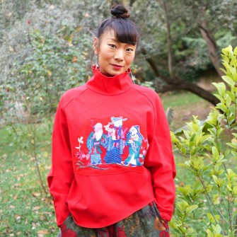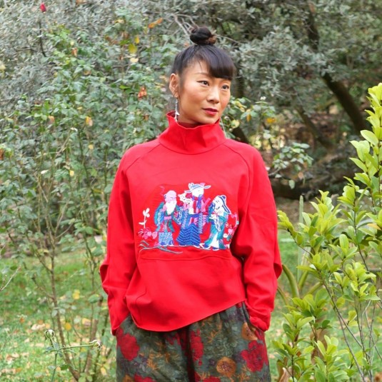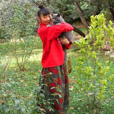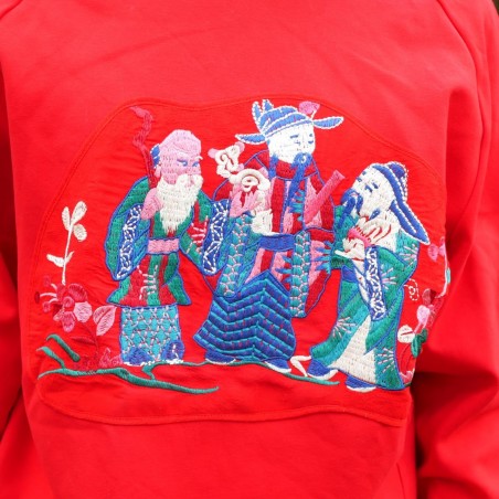 Les personnages mandarins représentés dans la broderie introduisent une référence culturelle claire, sans surcharge. Cette pièce s'adresse aux femmes qui aiment les vêtements originaux, les couleurs affirmées et les détails qui racontent quelque chose sans devenir démonstratifs.