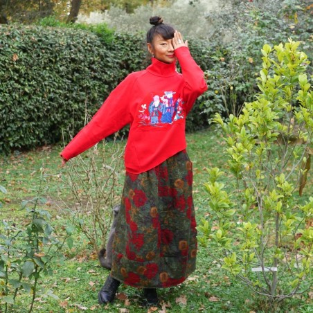 Ce haut rouge pour femme revisite l'esprit du sweat-shirt avec une approche plus singulière et expressive. Sa couleur vive attire le regard, tandis que la broderie artisanale en soie placée sur le devant lui donne une identité forte, immédiatement reconnaissable.