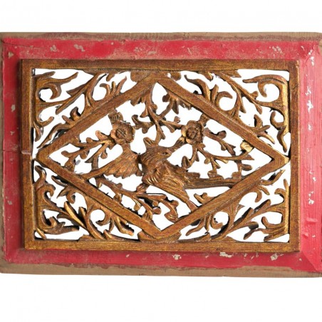 Cet élément de décor en bois peint, représentant un oiseau sur une branche de camélia est une...