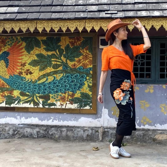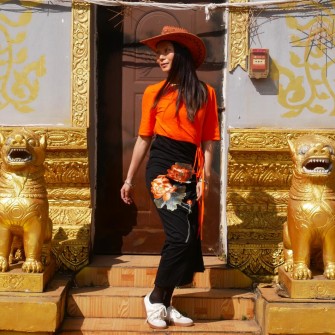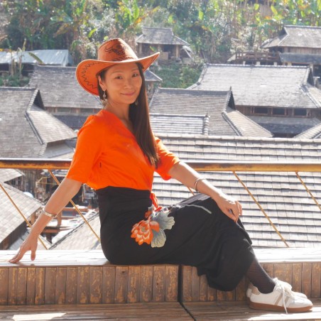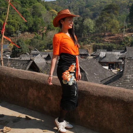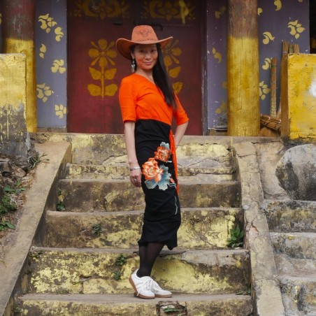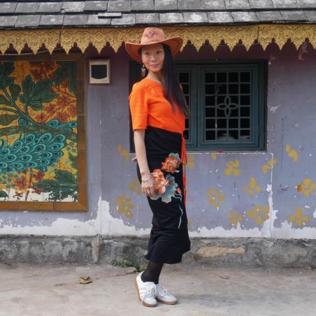Haut en lin flammé orange, jupe en modal-coton noir, le motif de lotus est réalisé en broderie artisanale. Le lin flammé a été prélavé.