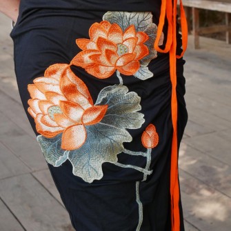La broderie de lotus est l’élément central de cette pièce. Les pétales délicats et les feuilles brodées semblent flotter doucement comme une fleur de lotus sur l’eau.