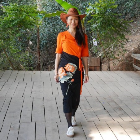 Une fleur de lotus lumineuse qui s’épanouit avec douceur et élégance. Cette robe associe la chaleur d’un orange lumineux à la profondeur d’un noir élégant. Le haut orange évoque la lumière douce du soleil et apporte énergie et chaleur à la silhouette.