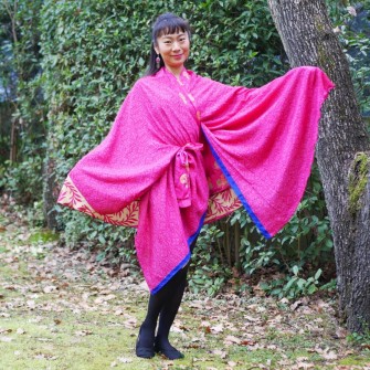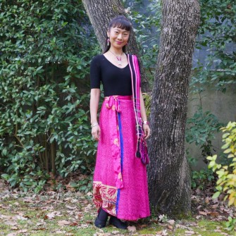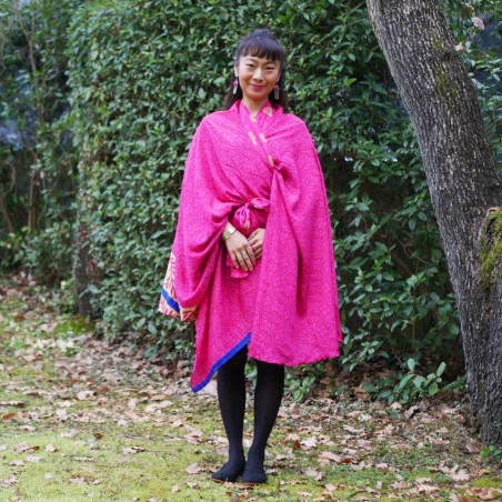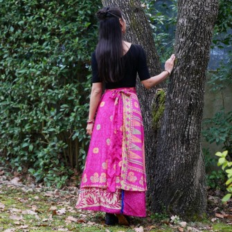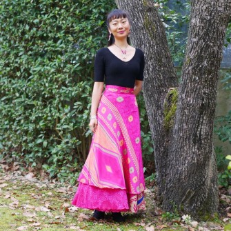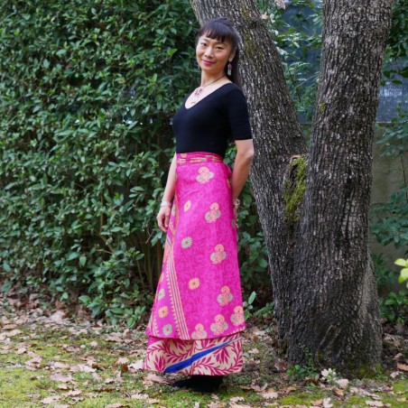 Cette jupe est transformable et peut-être portée soit en jupe (photo 1), soit en kimono (photo 2). Elle est réversible, l'imprimé du tissu étant différent sur les deux côtés. L'impression est réalisée manuellement par la technique du tampon avec des colorants entièrement naturels, issus de plantes, de fleurs ou autres.