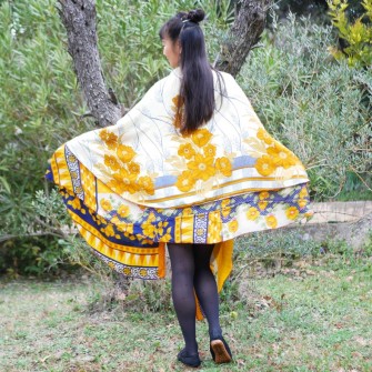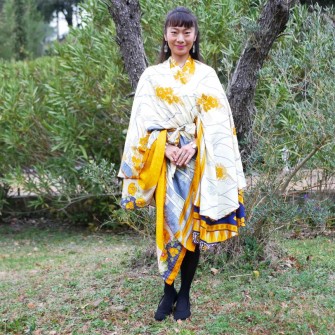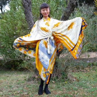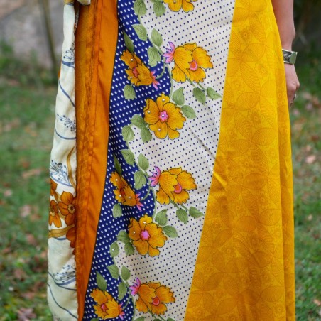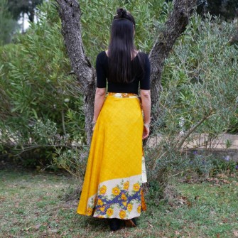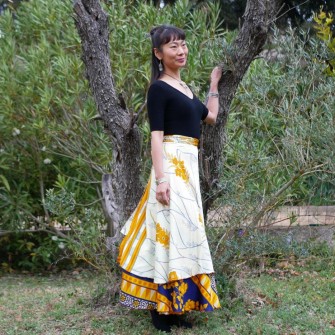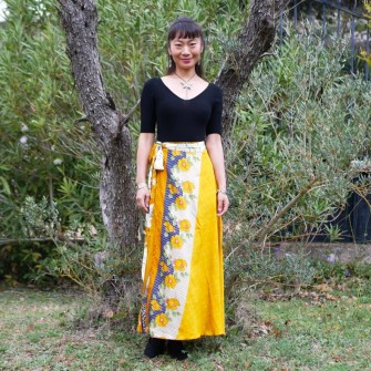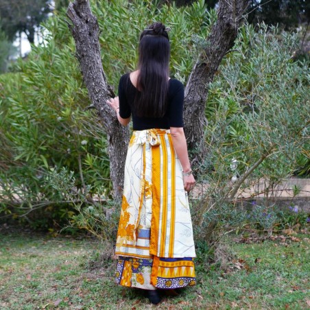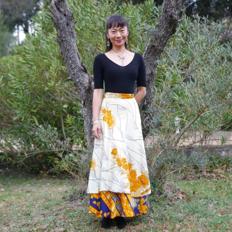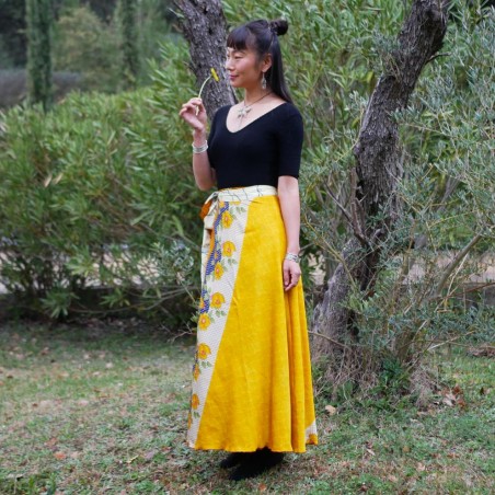 Cette jupe est transformable et peut-être portée soit en jupe (photo 1), soit en kimono (photo 2). Elle est réversible, l'imprimé du tissu étant différent sur les deux côtés. L'impression est réalisée manuellement par la technique du tampon avec des colorants entièrement naturels, issus de plantes, de fleurs ou autres.