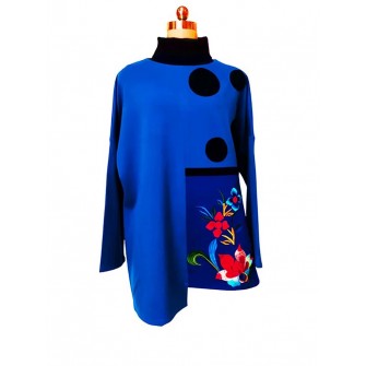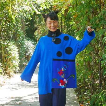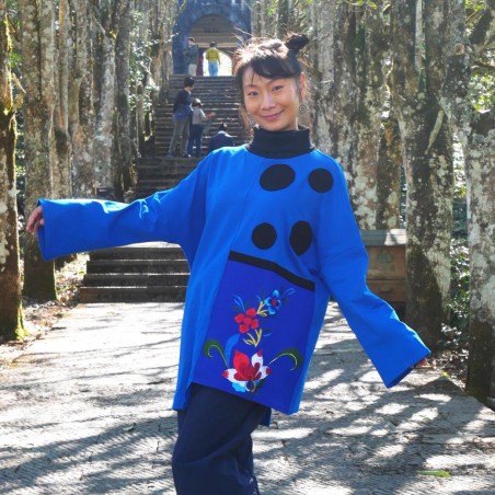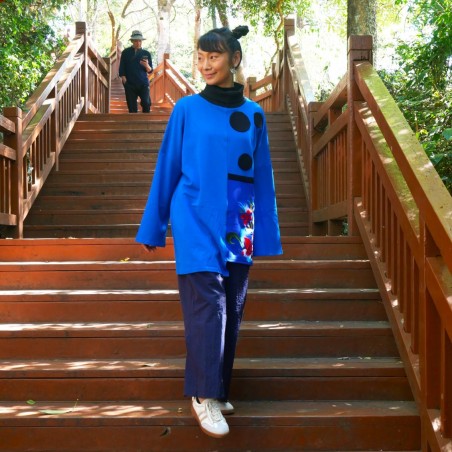Cette blouse se distingue par son jeu de contrastes entre différentes nuances de bleu. Le tissu en coton est doux et agréable à porter, tandis que la coupe ample offre une silhouette fluide adaptée à différentes morphologies. Les pois noirs apportent une touche graphique et légèrement ludique, qui dynamise l’ensemble. La broderie florale, réalisée avec soin, ajoute une note poétique et artistique à la pièce. Une blouse qui combine confort, simplicité et sens artistique.