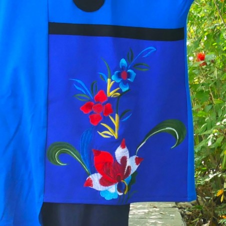 La broderie florale, aux couleurs vives et lumineuses, se déploie sur le bas de la blouse comme une fleur qui s’ouvre sur un ciel bleu.