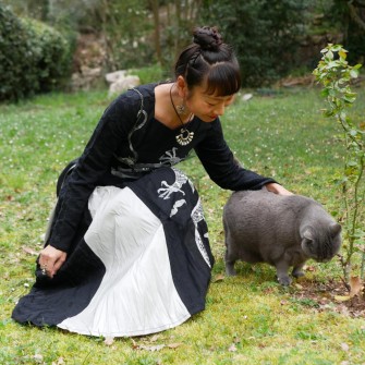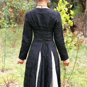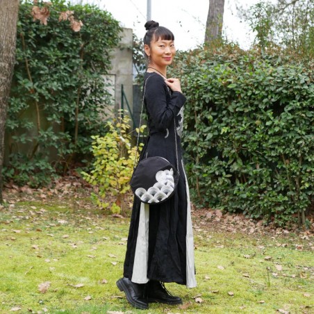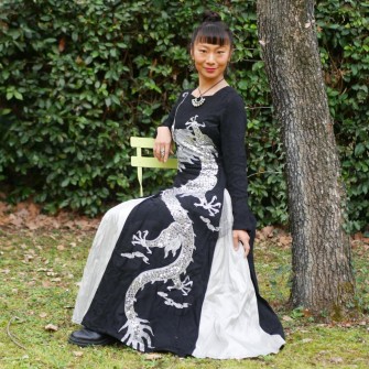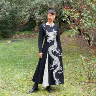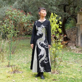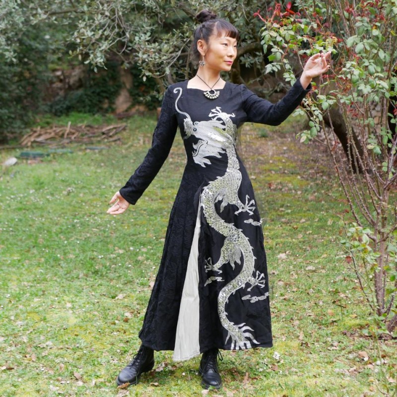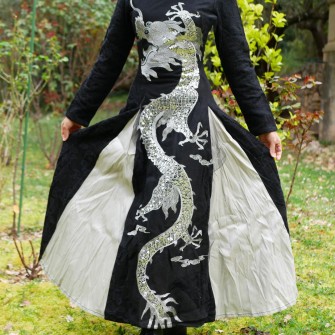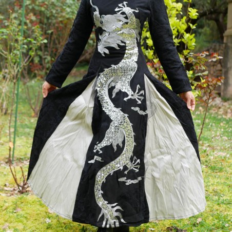 Cette robe s’inspire de la culture traditionnelle chinoise et du symbole mythique du dragon. Dans l’imaginaire oriental, le dragon incarne la force, la protection et la prospérité. La robe se distingue par une palette noire et argent, élégante et intemporelle. Le tissu principal est un coton-lin jacquard noir, structuré et riche en texture. L’intérieur de la jupe est doublé de soie thaïlandaise argentée qui révèle un éclat subtil à chaque mouvement, donnant à la silhouette une présence presque cérémonielle. L’élément central est la broderie du dragon argenté qui traverse la robe. Réalisée sur un voile léger et délicatement ornée de sequins, elle crée un effet lumineux et vivant. Le dragon semble onduler à travers les nuages, évoquant à la fois la tradition et la poésie. La taille est conçue avec un système d’ajustement discret, permettant d’adapter légèrement la robe à différentes morphologies et de mettre en valeur la silhouette avec élégance.