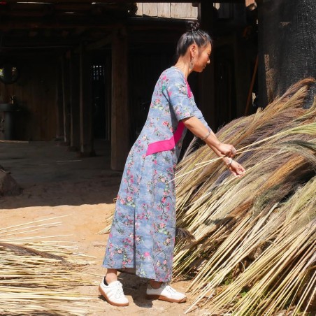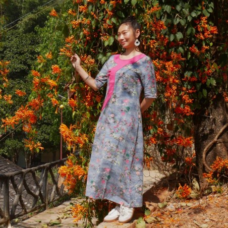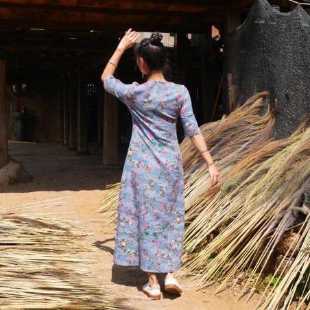 Cette robe longue se distingue par son fond gris bleuté, orné de fines branches fleuries qui apportent une touche poétique et naturelle. L’encolure et le panneau frontal sont soulignés par une bande rose en coton-lin, qui crée une ligne fluide et met délicatement en valeur la silhouette. La coupe ajustée reste confortable tout en donnant une allure élancée et élégante. Les manches mi-longues apportent équilibre et légèreté à l’ensemble du design. La robe est réalisée dans un tissu coton-lin, naturel, respirant et agréable à porter au quotidien.