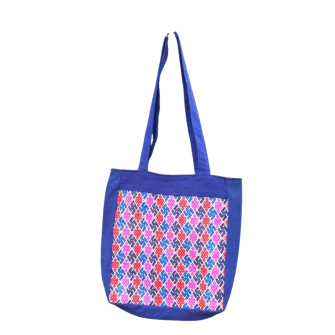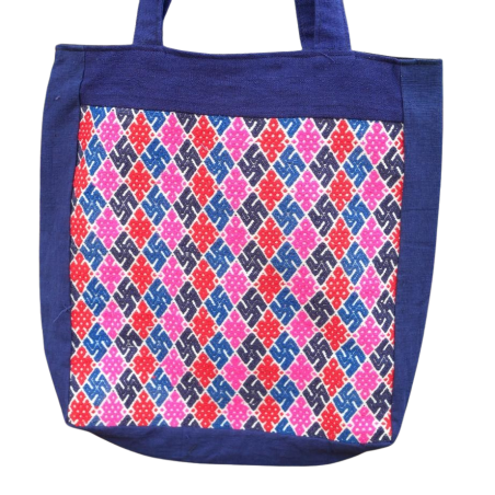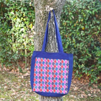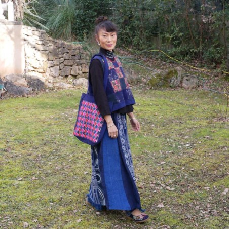 Ce sac cabas provient d'un artisanat de village Miao du Guizhou. Sur sa base en coton teint à l'indigo naturel vient se déployer une broderie traditionnelle en soie, dont le dessin et les couleurs chaudes donnent au modèle une présence visuelle élégante, immédiatement reconnaissable.