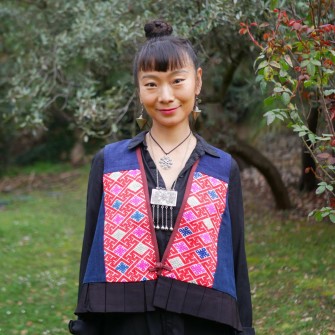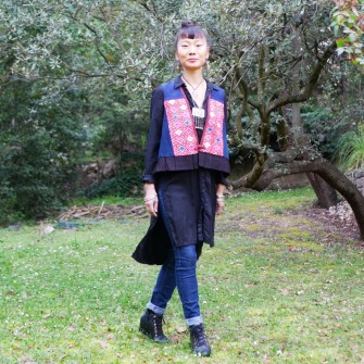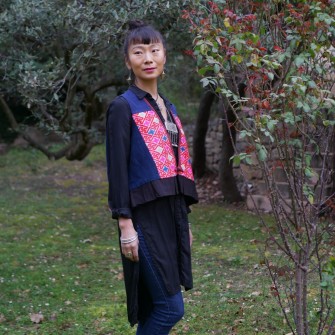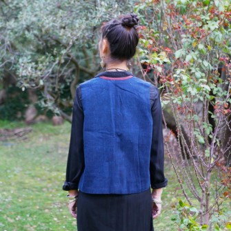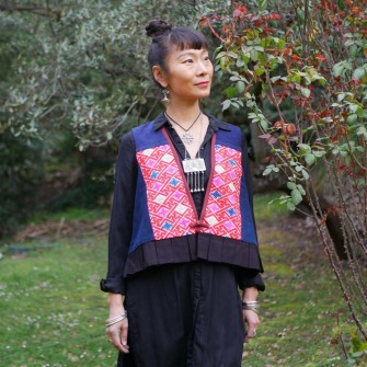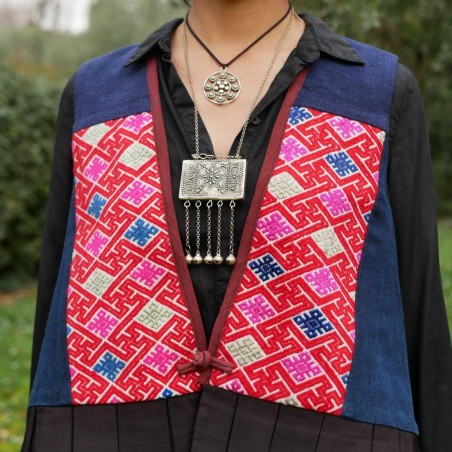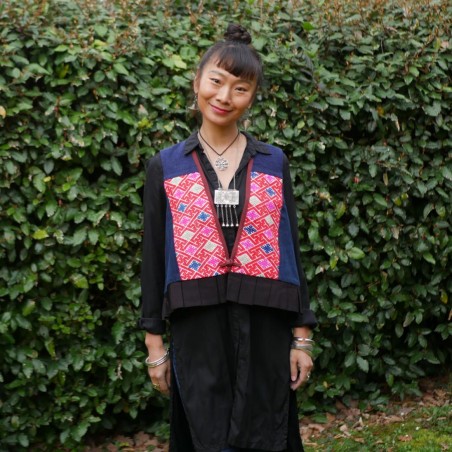 Magnifique gilet ethnique Miao, composé de pièces de batiks teintes à l'indigo naturel et de broderies anciennes, réalisée selon les traditions entièrement à la main par des femmes d'un village du Guizhou.