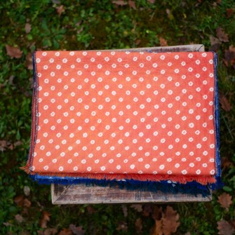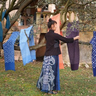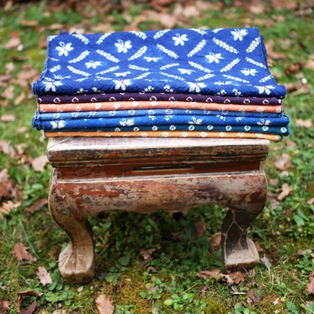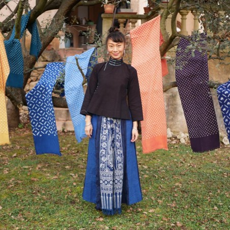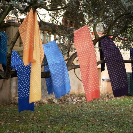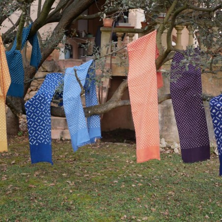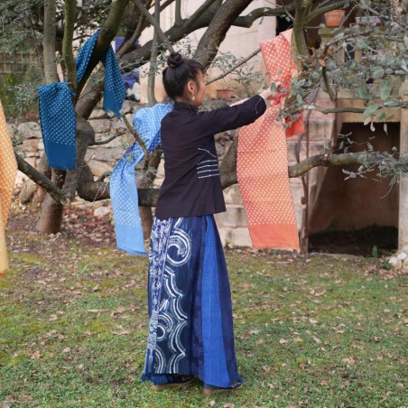 Confectionnée artisanalement au Yunnan, cette écharpe en coton met en valeur un travail de teinture batik réalisé à l'aide de colorants naturels. La technique de teinture par réserve, de nouage et de ligature donne au tissu son caractère visuel tout en conservant une grande souplesse au porté.