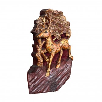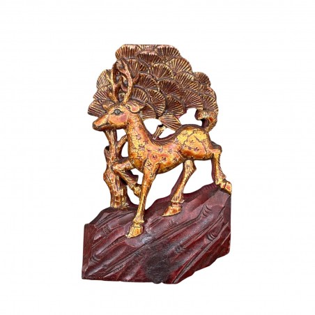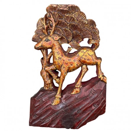 Ce chevreuil trottant dans la forêt en bois doré est une œuvre du XIXe siècle (époque de la dynastie Qing), que le cadre en bois de couleur noire partiellement ouvert sur le haut met magnifiquement en valeur. Ce type de sculpture était autrefois intégré dans la décoration de lits traditionnels chinois, ou parfois dans des fenêtres à claustra, dont ils ont été démembrés. On peut certes le regretter, mais les lits complets sont maintenant de plus en plus rares et atteignent des sommes considérables, dépendant à la fois de la décoration et des bois dont ils sont constitués. Vous en verrez une illustration sur le lien suivant: