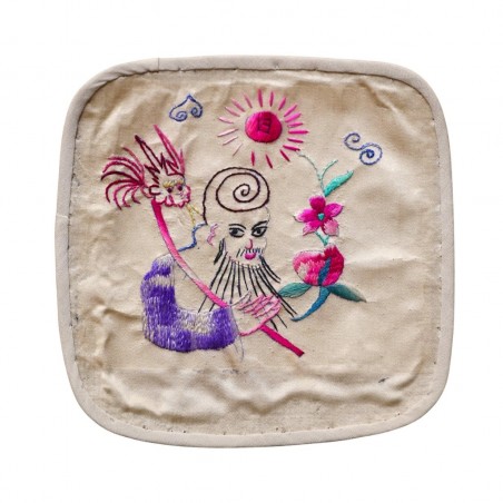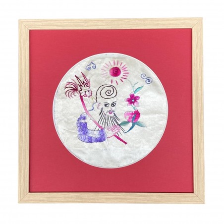 Cette broderie sur soie a été entièrement réalisée par une femme Miao du Guizhou selon les techniques traditionnelles. C'est un sujet exécuté exclusivement pour La Maison D'Echo avec ses propres dessins et spécifications.