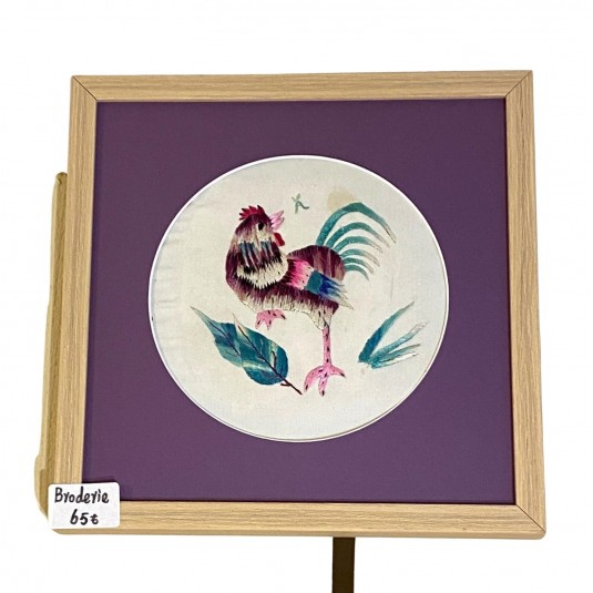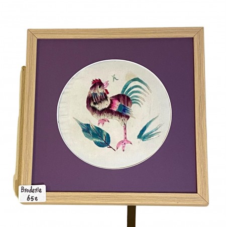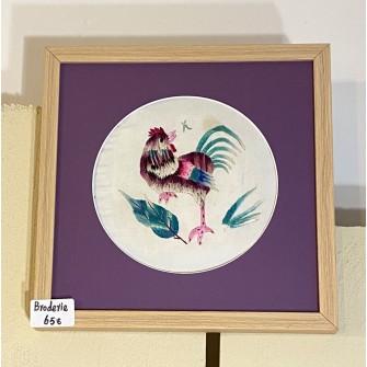 Cette broderie Miao met en valeur un motif de coq sur un fond violet profond, avec la finesse visuelle propre au travail de la soie brodée à la main. Présentée avec son cadre, elle s'intègre facilement dans un intérieur comme une petite oeuvre d'art à part entière.