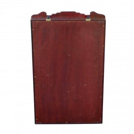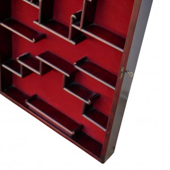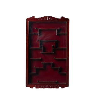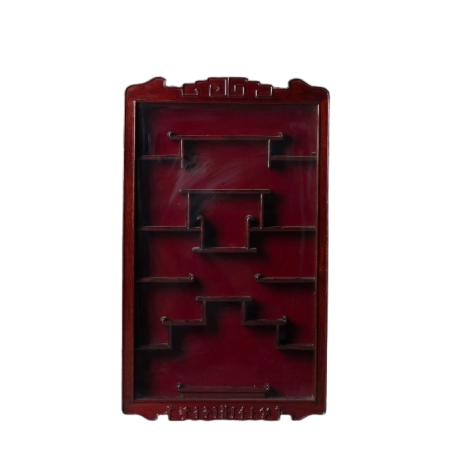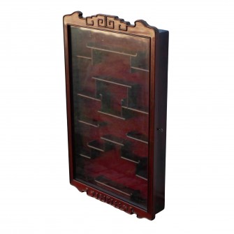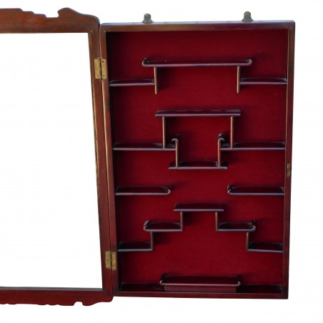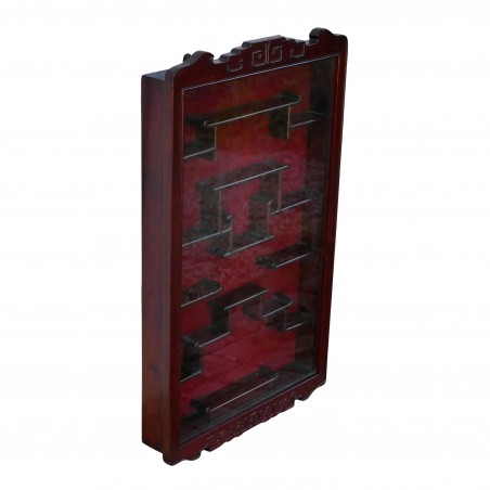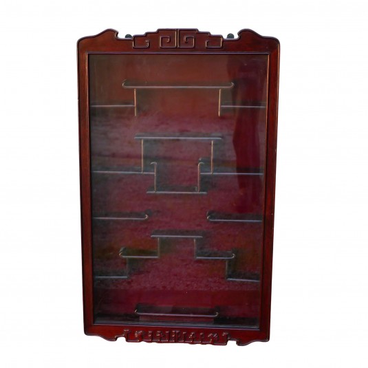 Cette vitrine, fabriquée en palissandre de Siam (hongmu en chinois), date de la première moitié du XXe siècle. Son style chinois très esthétique tout en restant épuré la rend très décorative, grâce au grain délicat de son bois et à sa couleur tendant vers le rouge foncé (Hongmu en chinois signifie bois rouge).
