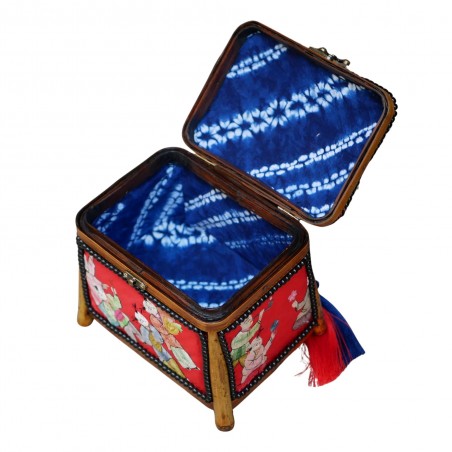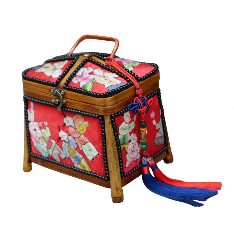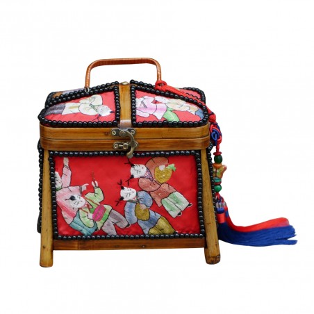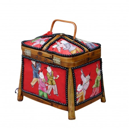 Ce précieux coffret à bijoux en bambou habillé de broderies Miao anciennes est un objet totalement artisanal et unique. Cette broderie provenant de vêtements Miao ancienne, probablement issue d'un porte-bébé, est animée de personnages en vêtements chinois traditionnels. l'intérieur du coffret est doublé d'un tissu teint à l'indigo naturel par la technique traditionnelle du batik. Le bambou est délicatement verni, ce qui lui procure une couleur chaude. Le coffret est équipé d'un fermoir.