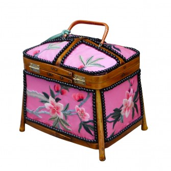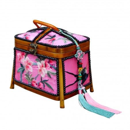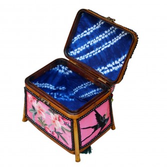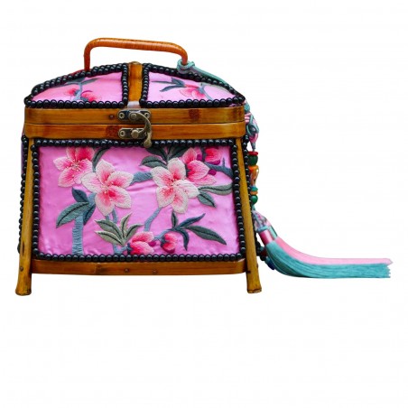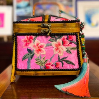 Ce précieux coffret à bijoux en bambou habillé de broderies Miao anciennes est un objet totalement artisanal et unique. Cette broderie provenant de vêtements Miao ancienne, probablement issue d'un porte-bébé, est décoré de fleurs de cerisier. l'intérieur du coffret est doublé d'un tissu teint à l'indigo naturel par la technique traditionnelle du batik. Le bambou est délicatement verni, ce qui lui procure une couleur chaude. Le coffret est équipé d'un fermoir.
