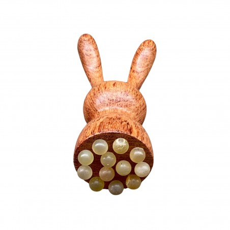 Ce bâton de massage "Petit Lapin" entièrement en matériaux naturels, bois de santal et embouts en corne de taureau, est adapté pour le massage du visage et du cuir chevelu ainsi que des méridiens en médecine chinoise. Conçu pour stimuler la circulation sanguine, revitaliser le cuir chevelu, réduire la chute de cheveux et apaiser les tensions. Sa forme ergonomique et ses 12 embouts larges, doux et souples permettent un massage profond et agréable. Son usage quotidien procure équilibre, stimulation et relaxation. Vous aurez d'autant plus de plaisir à l'utiliser que sa forme plaisante en fait aussi un objet décoratif.