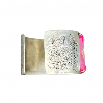 Bracelet en argent Miao orné d’une broderie ancienne Miao aux décorations de fleurs. L’artisan orfèvre, en combinant son art avec l’habileté des femmes Miao a composé un bijou d’une grande délicatesse et d’un goût exquis.