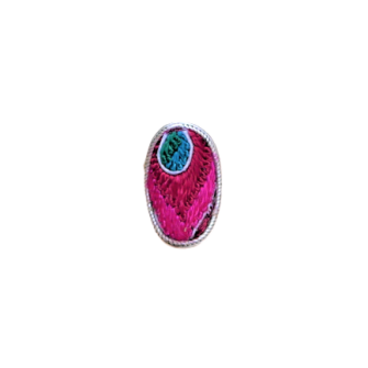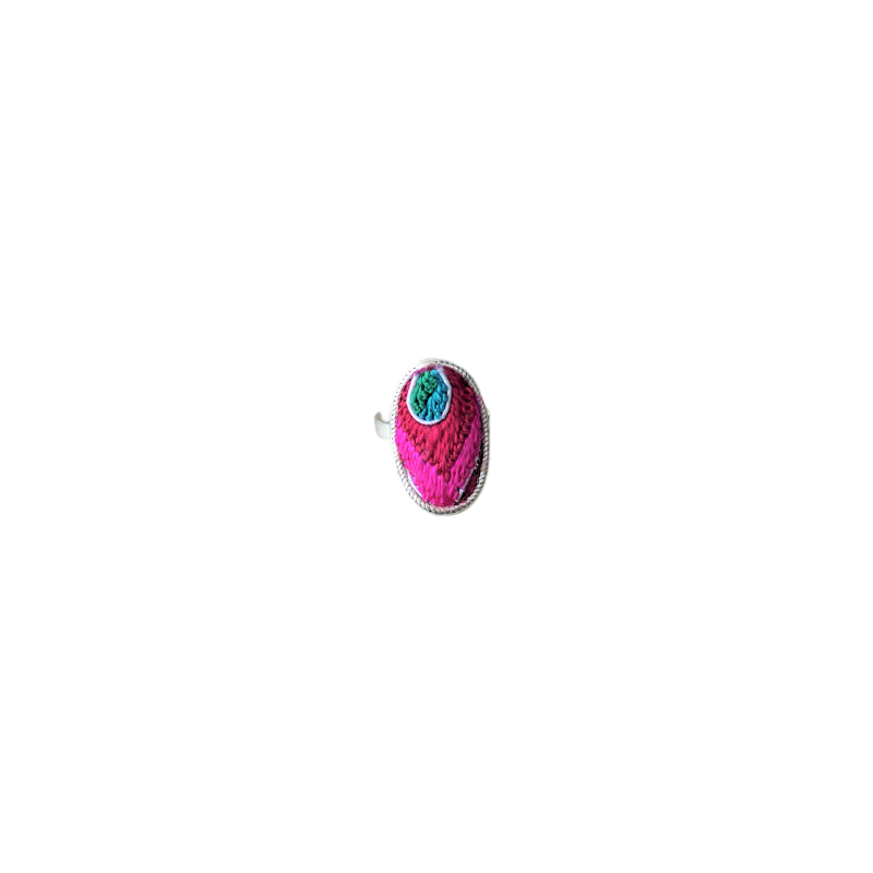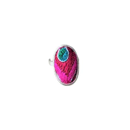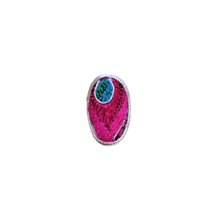 Bague réalisée par un artisan Miao. Le motif des broderies insérées dans les bijoux en argent Miao ont toujours pour origine des thèmes traditionnels au caractère ethnique affirmé dans l’assemblage des couleurs, mais dont les traits stylisés évoquent pourtant un certain modernisme. L’artisan joue avec les formes de ses bijoux en fonction de son imagination sollicitée par le dessin de la broderie.