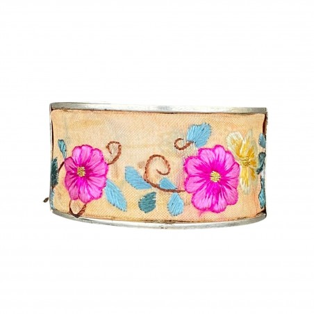 Bracelet en argent Miao orné d’une broderie ancienne Miao représentant des fleurs. L’artisan orfèvre, en combinant son art avec l’habileté des femmes Miao a composé un bijou d’une grande délicatesse et d’un goût exquis.