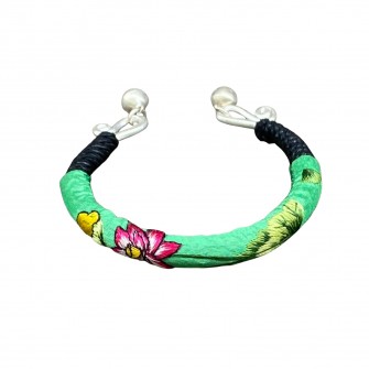 Bracelet en argent Miao orné d’une broderie ancienne Miao. L’artisan orfèvre, en combinant son art avec l’habileté des femmes Miao a composé un bijou d’une grande délicatesse et d’un goût exquis.