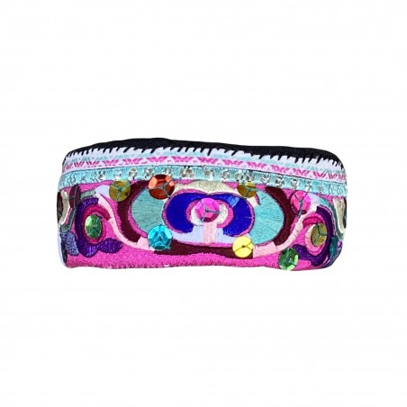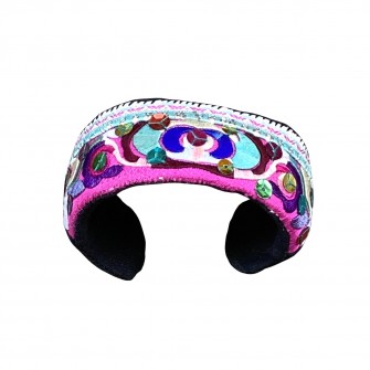 Bracelet décoré d’une broderie ancienne Miao aux décorations de fleurs et entièrement recouvert de tissu. Il possède une armature intérieure en argent Miao pour s'adapter aisément au bras de la personne.